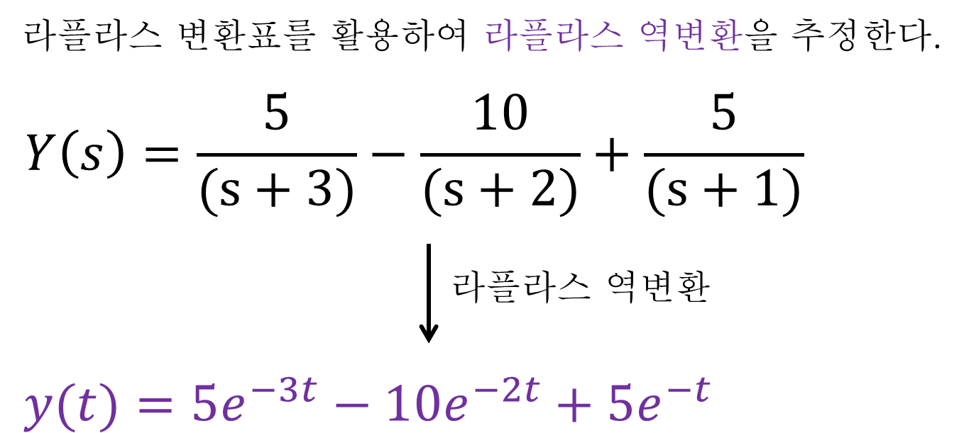 마지막으로 라플라스 변환표를 활용하여 복소수 s의 다항식을 역변환 해보자. 앞서 5절에서 소개한 바와 같이 모두 "지수함수"의 라플라스 변환이었음을 추정 할 수 있고, 역변환을 수행하여 모두 시간 t의 함수로 표현할 수 있게 되었다. 이 y(t) 함수가 바로 미분방정식의 풀이 결과다.