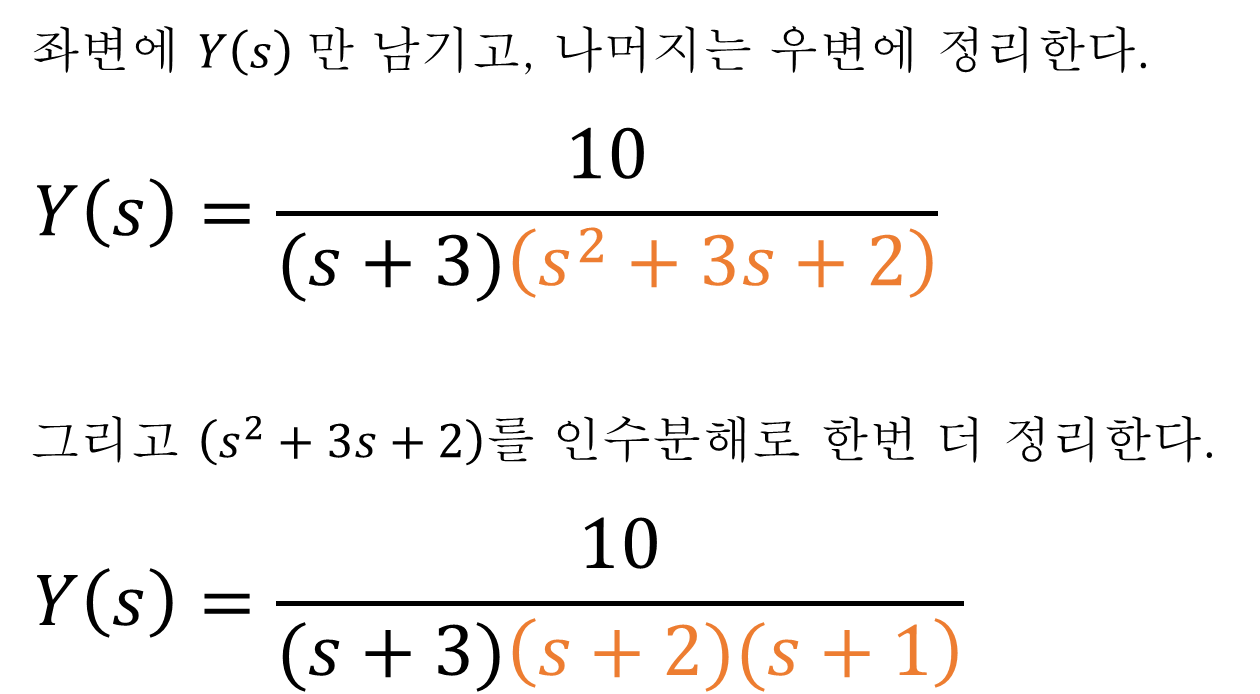 일단, 라플라스 영역의 다항식을 잘 정리하여 Y(s) = something... 의 형식으로 만들어 보자.