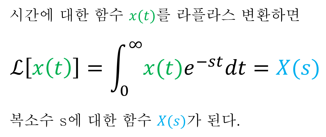 시간에 대한 함수 x(t)가 있다. x(t)에 대한 라플라스 변환은 다음 식과 같이 정의하고 계산한다. 결과적으로 시간에 대한 함수 x(t)를 라플라스 변환하면 복소수 s에 대한 함수 X(s)로 변환된다.
