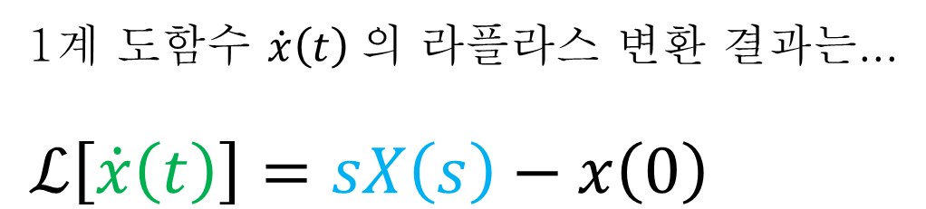 x(t) 함수는 어떤 진동시스템의 변위 함수다. 변위 x(t) 의 1계 도함수 x'(t)는 속도, 2계 도함수 x''(t)는 가속도임을 알고 있다. x(t)의 1계 도함수 x'(t)를 라플라스 변환하면 다음 식과 같이 표현할 수 있다.