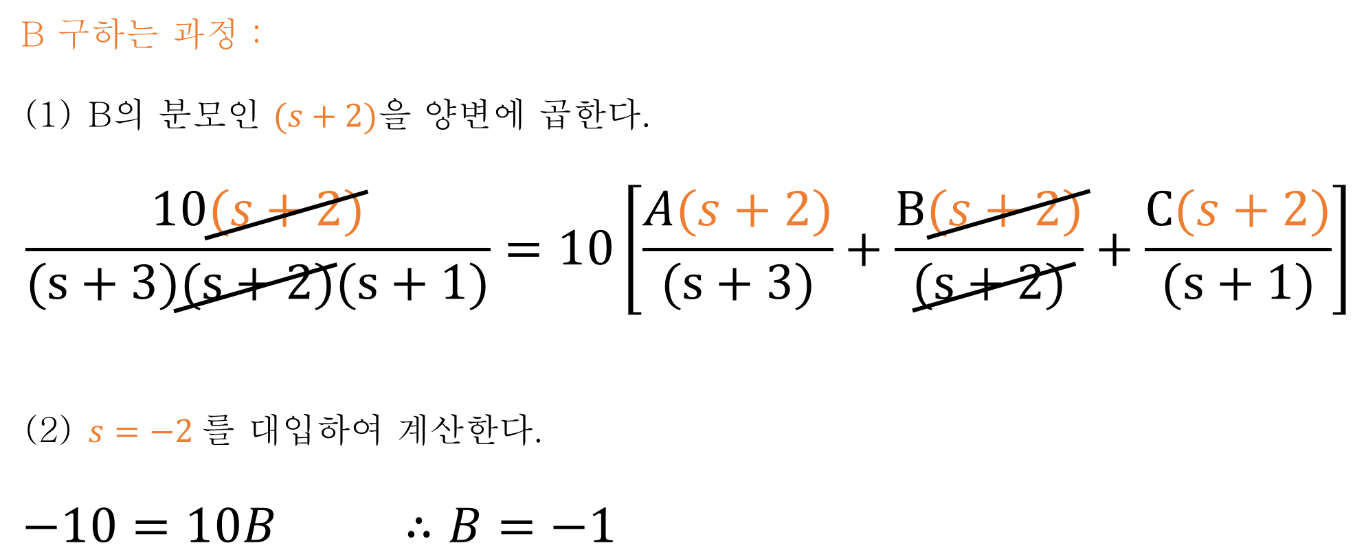 B를 구하는 과정도 A와 마찬가지다. B의 분모인 (s+2)을 양변에 곱한 뒤, s=-2을 대입하여 B를 구할 수 있다.