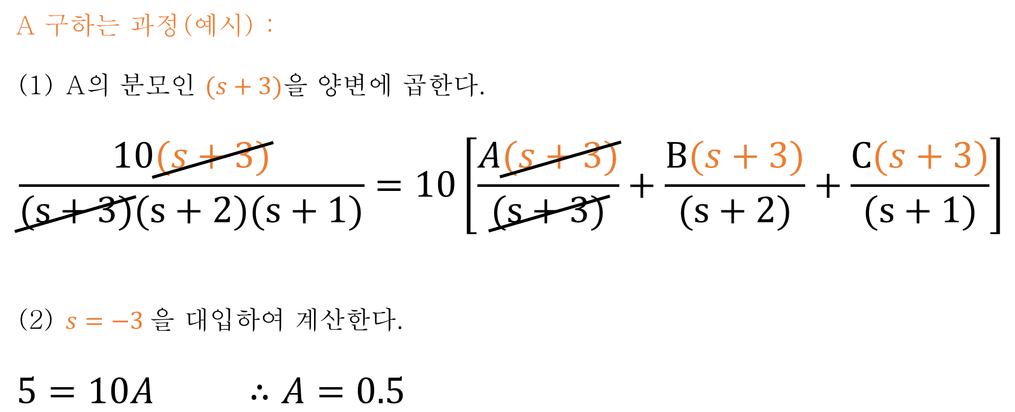 위 예시를 조금 더 계산해서 A, B, C를 구해보자. 먼저, A를 구하려면 A의 분모인 (s+3)을 양변에 곱한 뒤, s=-3을 대입하여 A를 구할 수 있다.