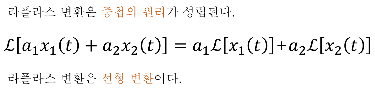 라플라스 변환도 중첩의 원리가 성립하는 선형 변환(Linear Transform)이다. (※ a1 및 a2 는 실수 스칼라 상수이다.)
