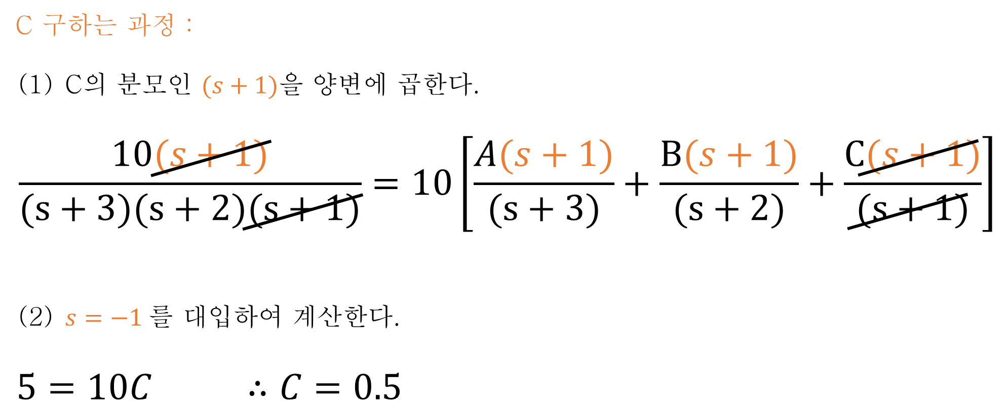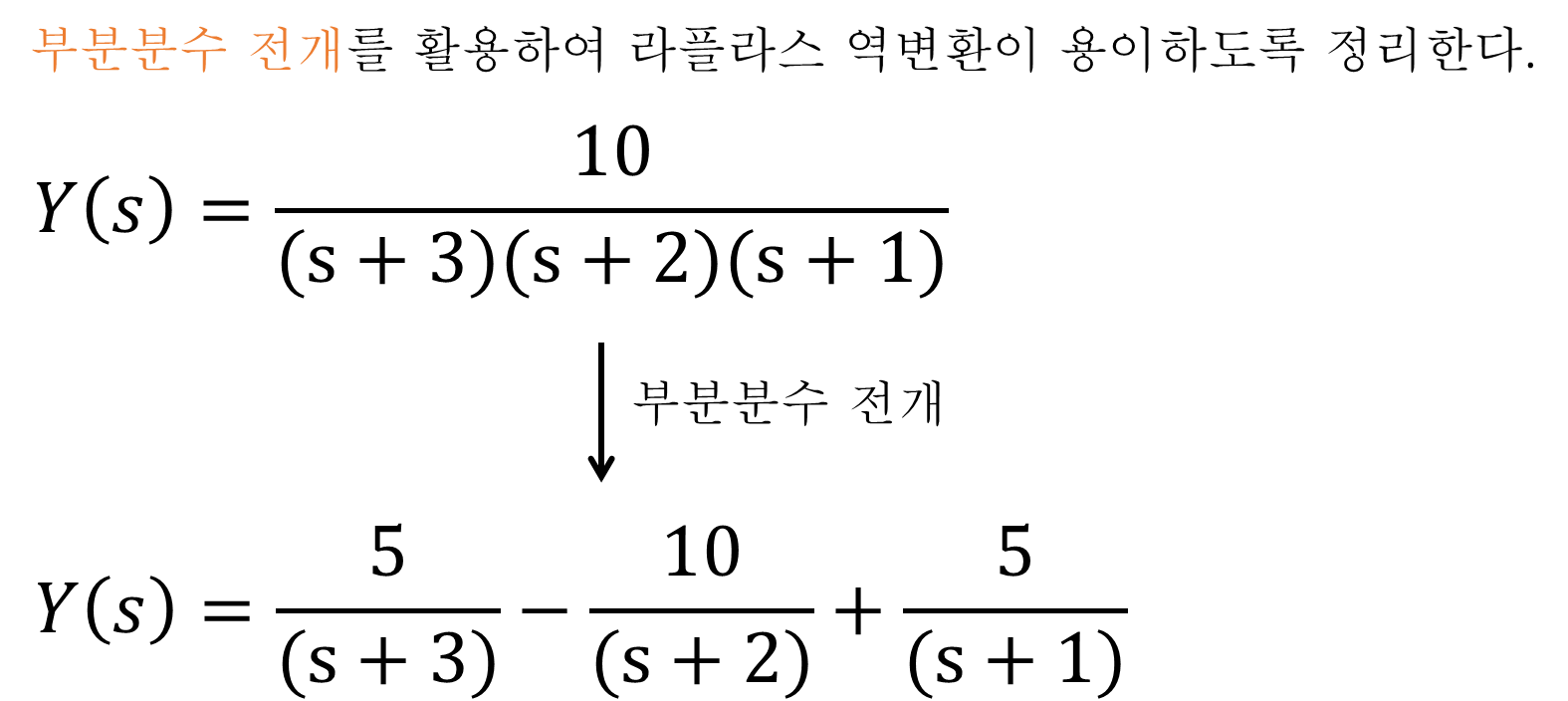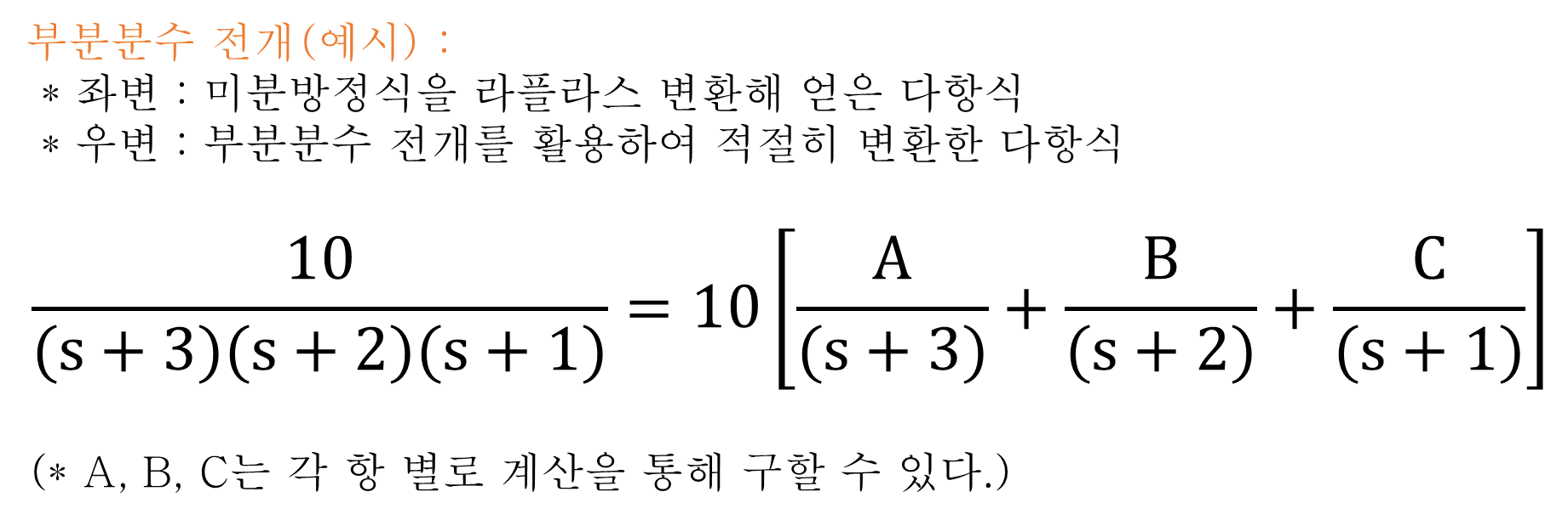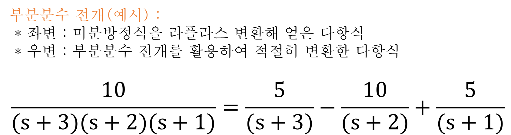 아래 식의 좌항에는 미분방정식을 라플라스 변환하여 얻어진 s에 대한 다항식이 있다. 우항에는 부분분수 전개를 활용하여 좌항의 다항식을 적절히 변형한 식이 있다.