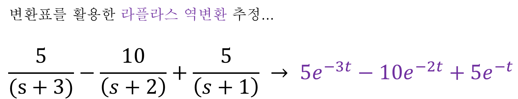 앞서 4장에서 부분분수 전개를 통해 적절히 변환한 다항식을 다시 활용해보자. 다항식 분모에 (s+3), (s+2), (s+1) 이 있다는 점에 주목하여 라플라스 변환표와 비교해보면 "지수 함수의 라플라스 변환" 이었음을 추정할 수 있다. 따라서, 변환표를 활용하여 라플라스 역변환을 추정해보면 아래 식과 같이 쓸 수 있다. (* 라플라스 역변환을 "추정" 한다는 말과 "수행" 한다는 말은 큰 틀에서 같은 말이다.)