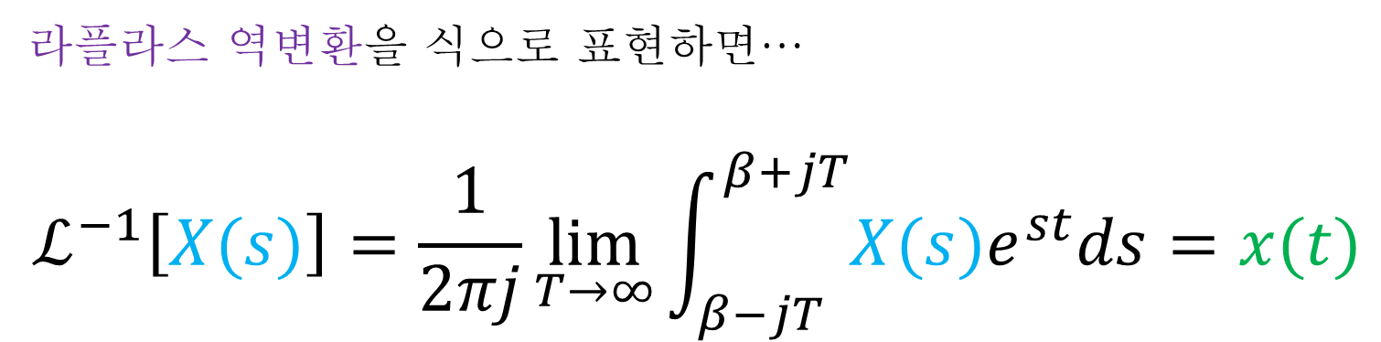 미분방정식으로 표현된 시간 영역의 함수 x(t)를 라플라스 영역 함수 X(s)로 변환할 수 있다면, 반대로 X(s) → x(t)로 역변환할 수도 있을 것이다. 이를 “라플라스 역변환(Inverse Laplace Transform)” 이라고 한다. 라플라스 역변환은 다음 식과 같이 정의된다.