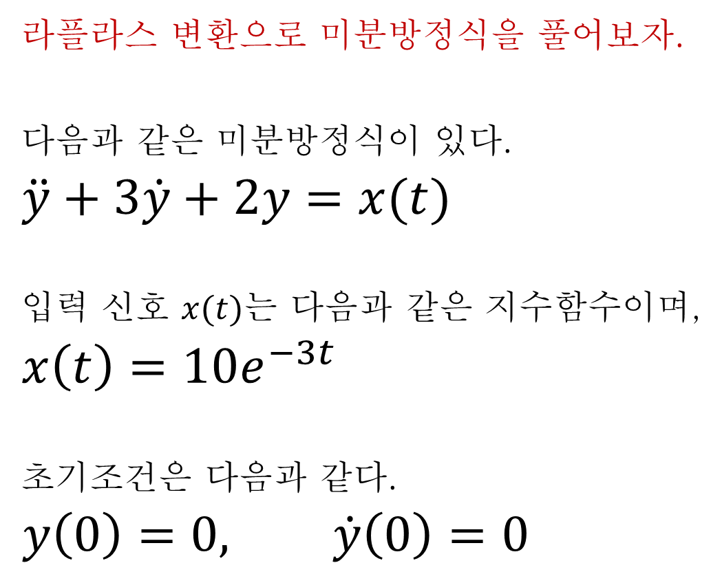 다음과 같이 y''+3y'+2y = x(t) 라는 미분방정식이 있다고 해보자. 이 미분방정식의 해를 라플라스 변환으로 구해보자.