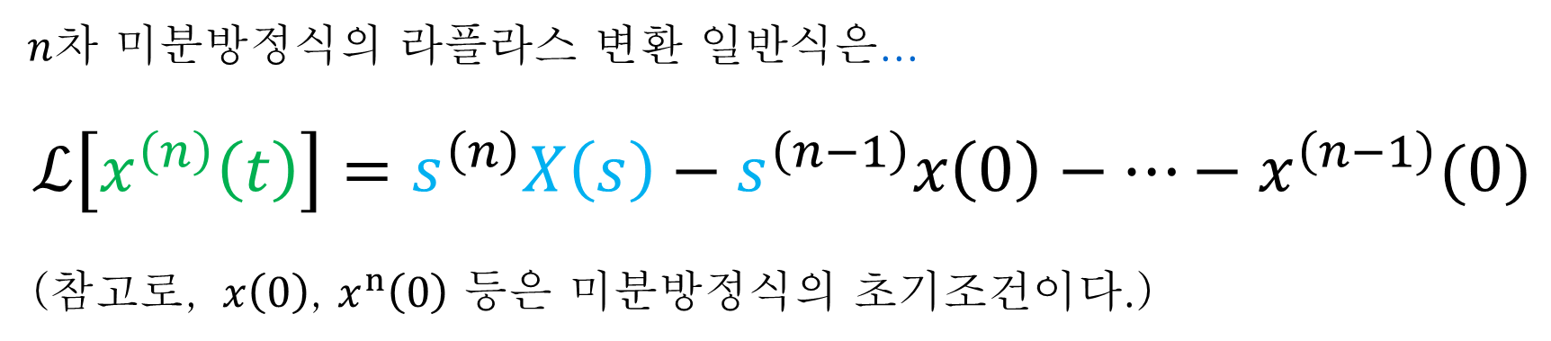 n차 미분방정식의 라플라스 변환 일반식은 다음과 같이 쓸 수있다. (※ 여기서 x(0)으로 표현된 항들은 미분방정식의 ‘초기조건’에 해당한다.)