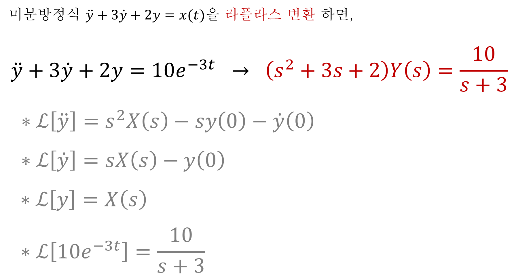 이처럼, 라플라스 변환을 하면 미분방정식을 s에 대한 다항식 함수로 변환하여, 상대적으로 쉽게 풀이할 수 있는 상태로 만들 수 있다. (* 게다가 초기조건을 어떻게 정의하느냐에 따라 더욱 단순화시킬 수 있다.)