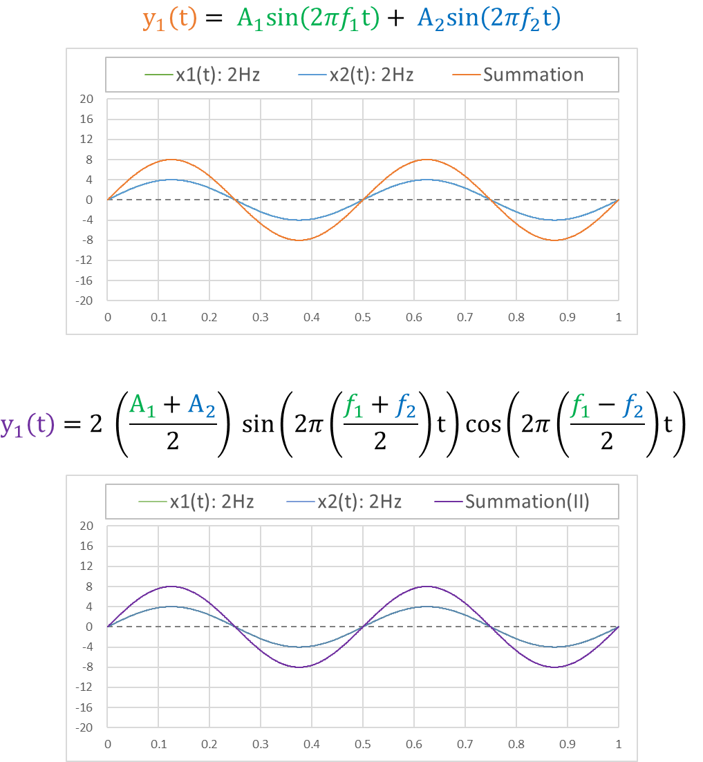두 sine파 신호의 합(+) 계산식을 y₁(t) 라 하고, 곱(×) 계산식을 y₁(t) 라고 해보자. 그리고 각각의 그래프를 그려보면, 아래 그림과 같이 동일한 그래프가 얻어지는 것을 알 수 있다.
