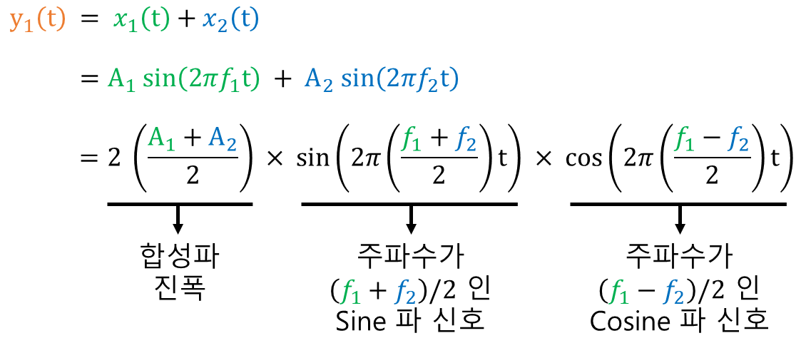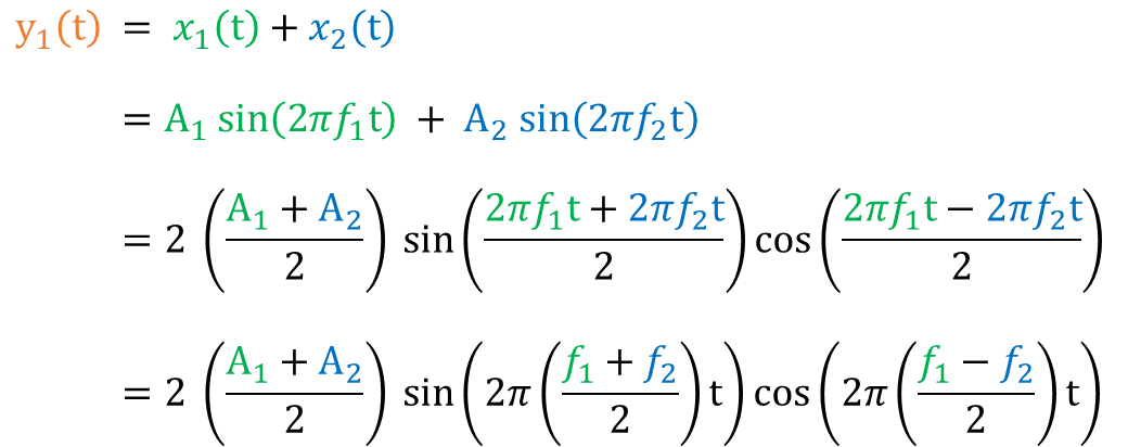 앞서 소개한 계산식을 다시 불러와보자. 두 sine파를 합(+) 한 y₁(t) 는, 아래 식 처럼 (진폭) × (sine파) × (cosine파) 와 같이 곱(×) 으로 구성되는 것을 알 수 있다. (※ 참고 : sine파의 주파수 (f₁ + f₂)/2 는 두 주파수의 평균이고, cosine파의 주파수 (f₁ - f₂)/2 는 두 주파수 차의 절반이다.)