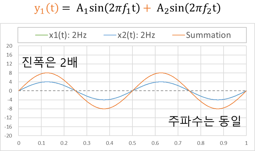 계산식도 그래프와 같은 결과를 나타낸다. 즉, 동일한 두 sine파를 합(+)하면 진폭은 2배가 되고, 주파수는 동일하다는 것을 알 수 있다.