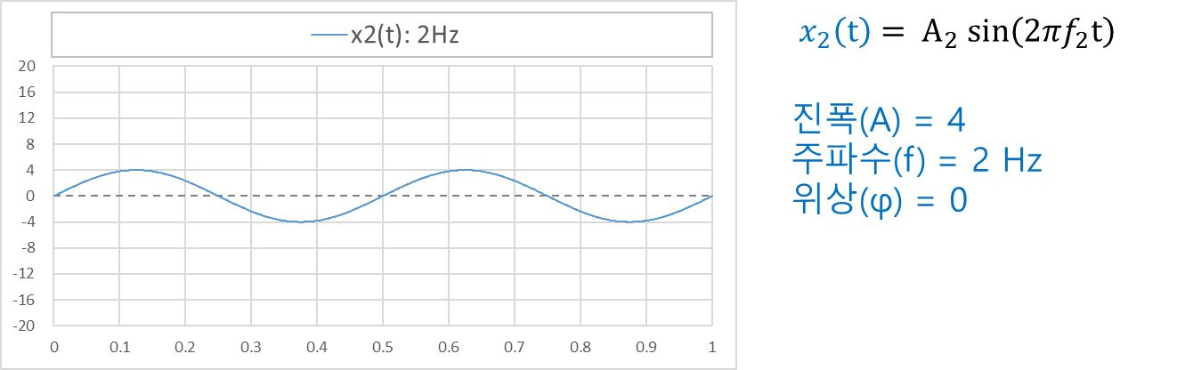 우선, 진폭 4, 주파수 2 Hz, 위상 0 인 두개의 동일한 sine파 신호를 만들어, x₁(t) 와 x₂(t) 라고 표시했다. (※ 계산의 편의를 위해 두 sine파 신호의 초기 위상(φ)은 '0' 으로 설정해둔다.)