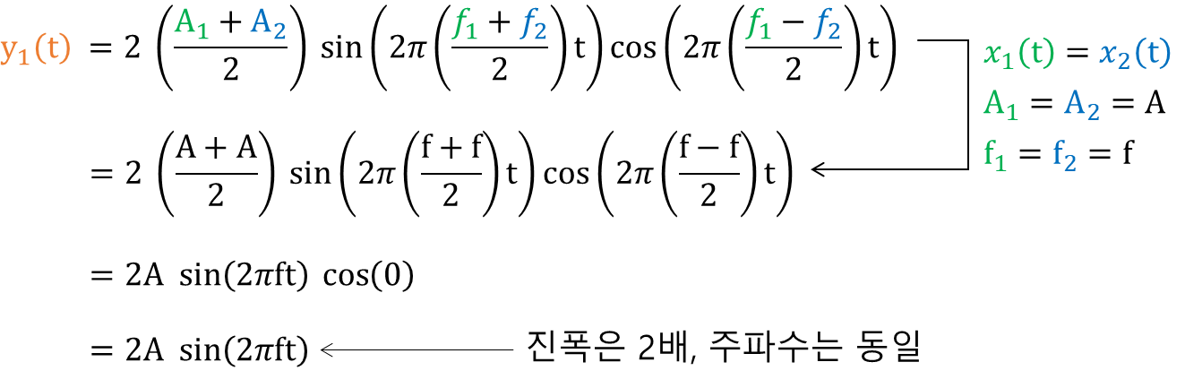 두 sine파 신호가 서로 동일하다고 하였으므로, x₁(t) = x₂(t) 이고, A₁ = A₂ = A 및 f₁ = f₂ = f 라고 둘 수 있다. 그러면, 두 신호의 합(+)인 y₁(t) 은 다음과 같이 계산된다.