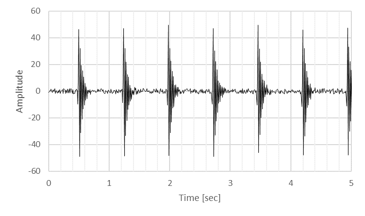 충격 신호 중, 아래 그래프 처럼 주기적으로 반복되는 경우가 있다. 이런 파형도 큰 틀에서 주기성 신호라고 할 수 있다. 상기 (1)~(3) 신호는 전기전자 분야에서 많이 다루겠으나, 소음진동 분야에서는 아래 그래프에 나타난 것과 비슷한 류의 주기성 신호를 훨씬 많이 접하게 된다.