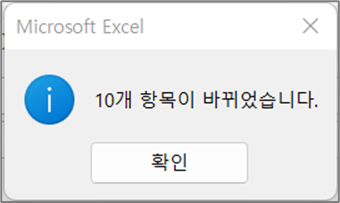 찾을내용에 70, 바꿀내용에 80을 입력하고, [모두바꾸기] 를 눌러서준다. 그러면, 선택한 10개 항목이 바뀌었다는 메세지가 뜬다. (그 후, [닫기] 눌러서 빠져나온다.)