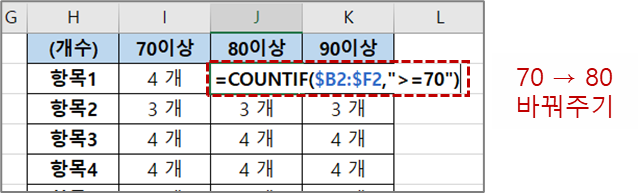 그리고 오른쪽 표에는 70점이상, 80점이상, 90점이상의 값이 각 항목별로 몇개씩 있는지 표시하려고 한다.