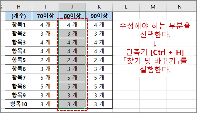 [K열] 의 70 → 90 변경도 같은 방법으로 수행하면 된다. 아래와 같이 순차적으로 그림으로만 표시했다.