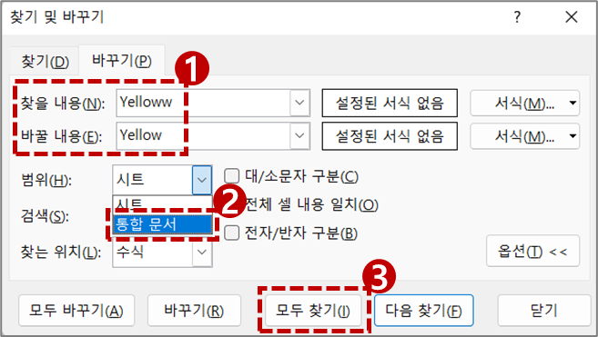 [찾을내용] 칸에 오타인 Yelloww 를 입력하고, [바꿀내용]에는 Yellow 라고 입력하자.