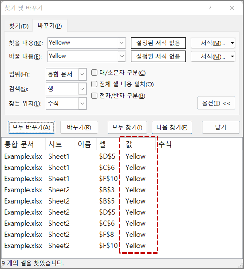 Sheet1 과 Sheet2 를 포함한 문서 전체에서 Yelloww 라는 단어를 찾은 결과를 보여준다. 우리가 이미 알고 있듯이, 총 9개의 Yelloww 오타가 찾아졌다.