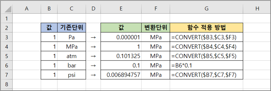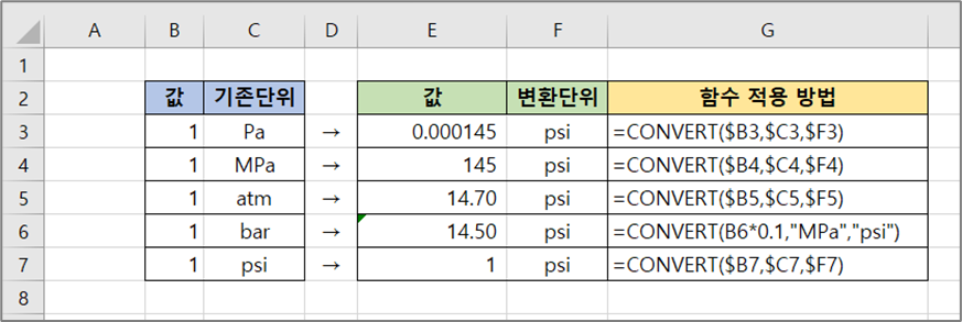 3. CONVERT 함수로 처리할 수 있는 압력 단위들